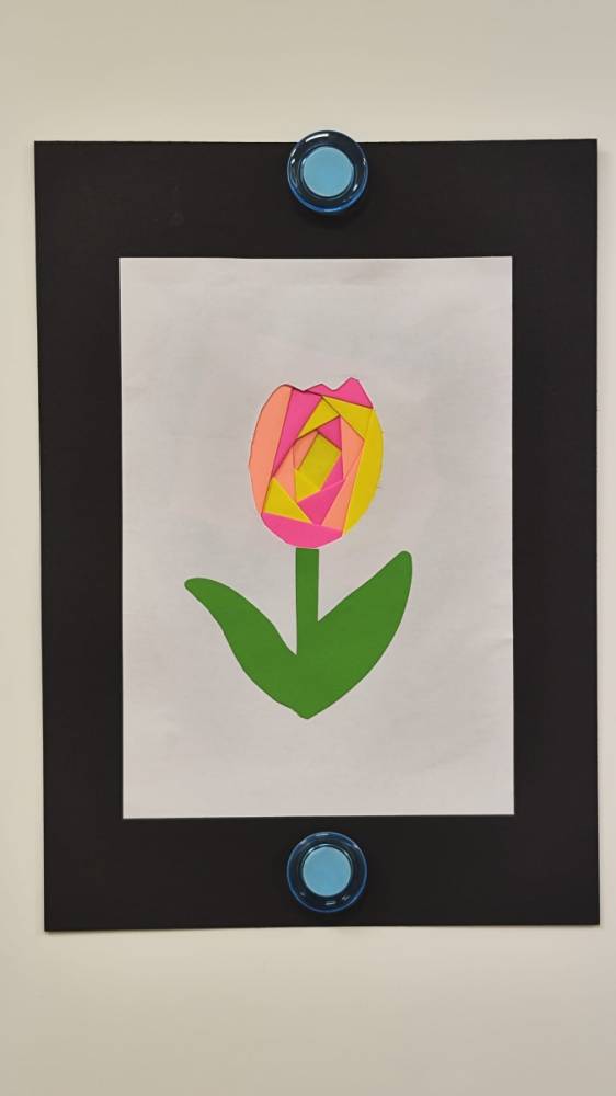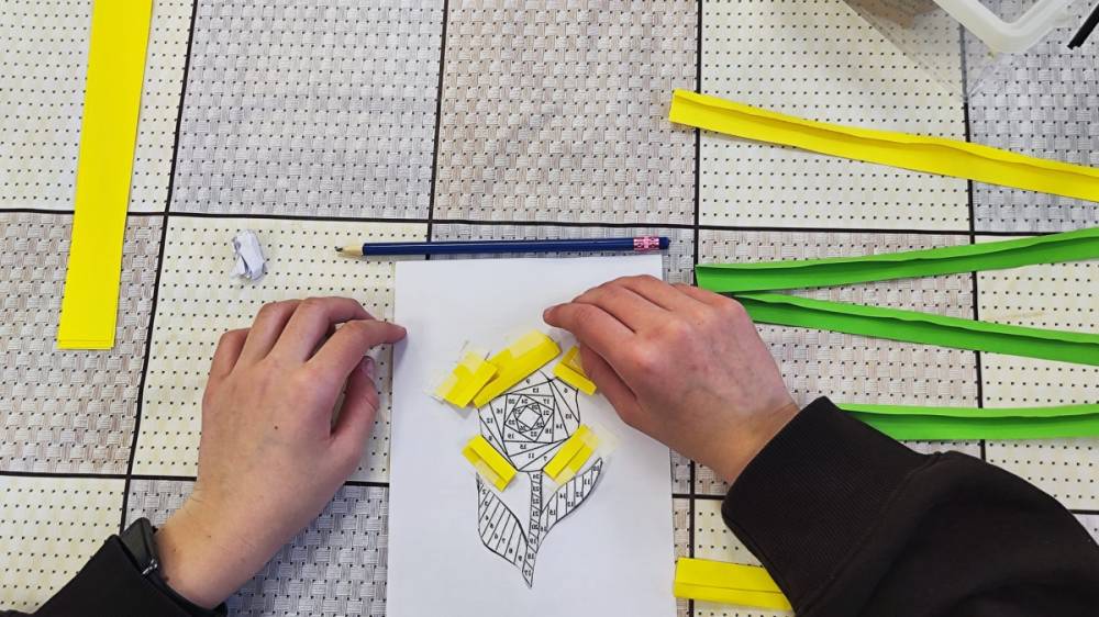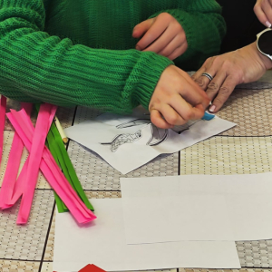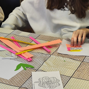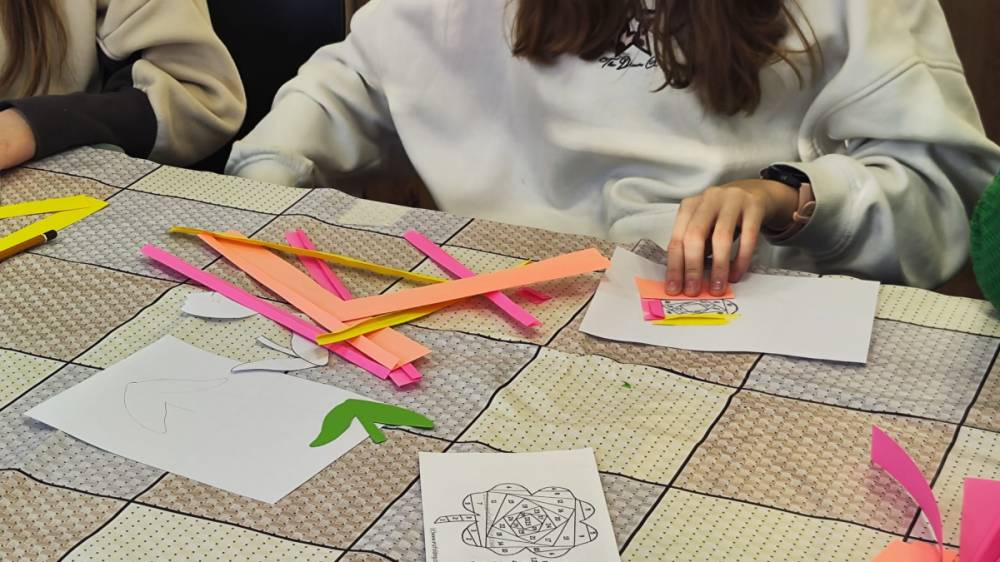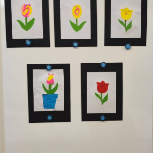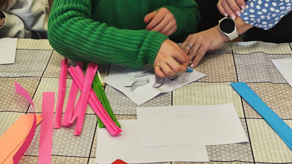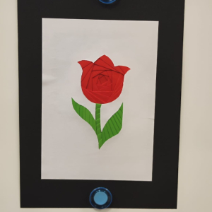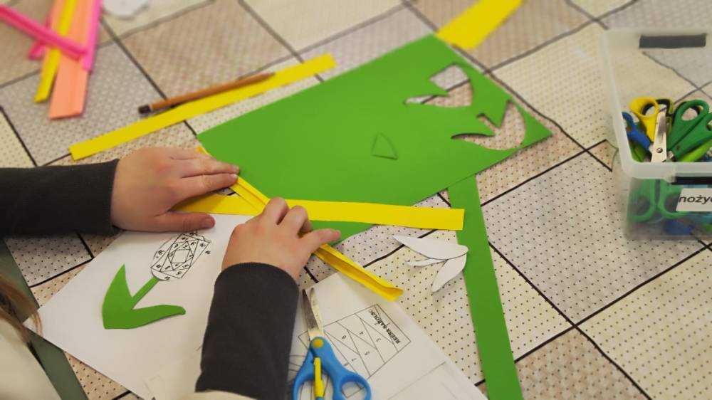 Podczas zajęć plastycznych uczestnicy stworzyli piękne kolorowe kwiaty wykonane techniką Iris Folding. Z kawałków barwnego papieru powstały niezwykłe tulipany i róże, które wprowadziły do biblioteki prawdziwie wiosenny nastrój.